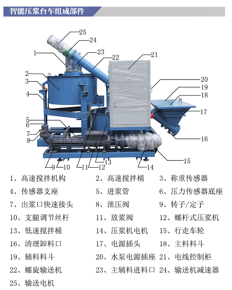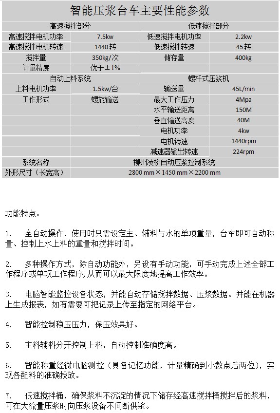 本台车设计为移动式,主要由自动上料系统、自动称重系统、微电脑自动控制系统(具备记忆功能,计量精确到小数点后两位)、高低速搅拌系统、供水系统和行走系统等部分组成。该设备高速搅拌部分一次最多可搅拌 350 公斤浆料,每小时可搅拌 4000~7000 公斤浆料(手动控制时)。另外设有低速搅拌储料桶,可容纳高速搅拌桶已搅拌完成的浆料。高低速搅拌桶相配合,可实现向压浆设备不间断供料。